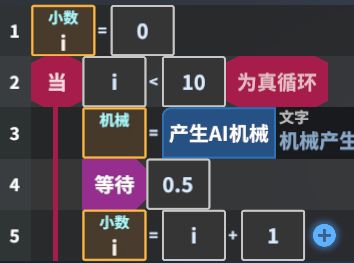 但是这里有个问题,因为这10个敌人是同时产生的,会挤在一起,我们可以打开蓝色的“逻辑方块”中的“自动事件”中的方法,在每个产生AI机械语句后添加一个等待语句,并选择“创建变量/小数”,数值填0.5即可。