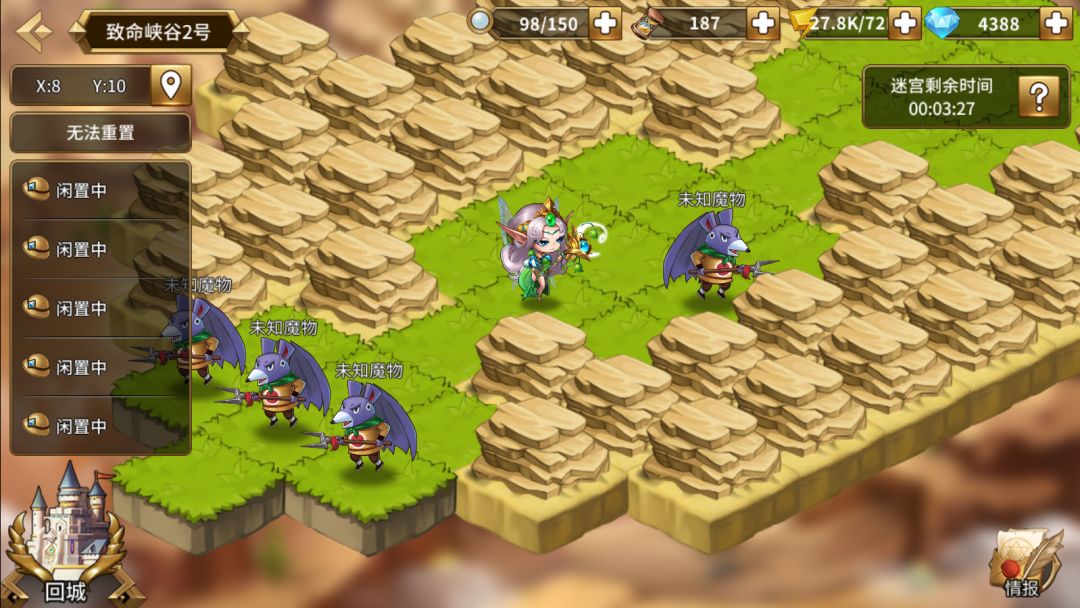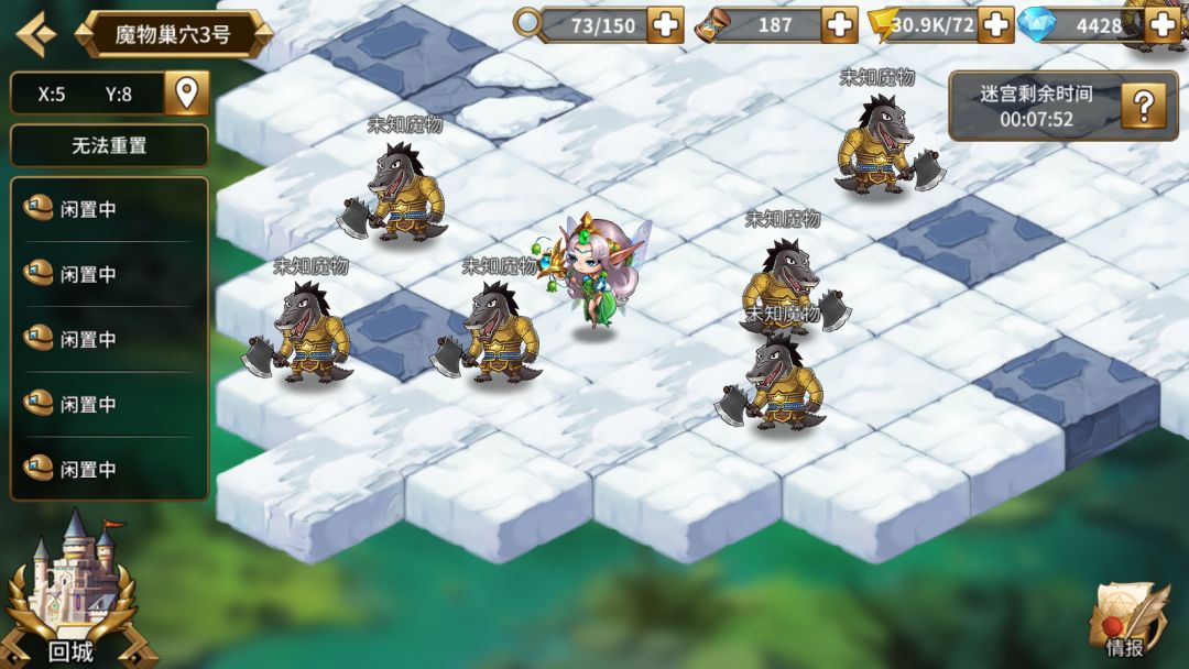 魔物巢穴的地图大小和前面的几个差不多大,但是地图中刷出来的都是未知魔物,地图上的魔物等级不一,打败魔物后会产出生命精华及金币。不过这种难打的地图还是要慎重的选择进入哦,毕竟一不小心可能就会遇到战斗失败的情况!善用快速跳过也可以获得更多的资源哦——