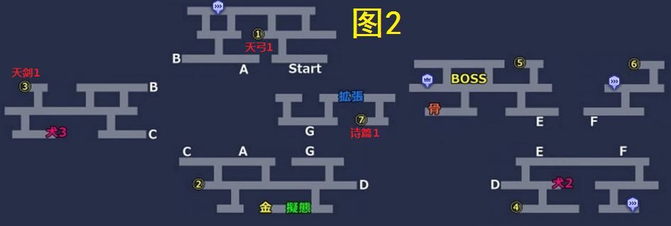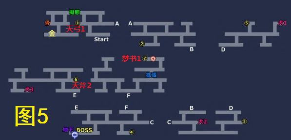 每张地图1个,点”金”获取(金蛋状),获取后可开启标有"拡張"处的地图,不获取的话拿不到此处宝箱。全获取后会自动拼接成图6中只有G入口的那张图,每个扩展芯片会开启这张图的一部分。