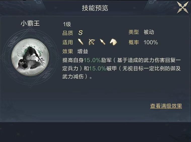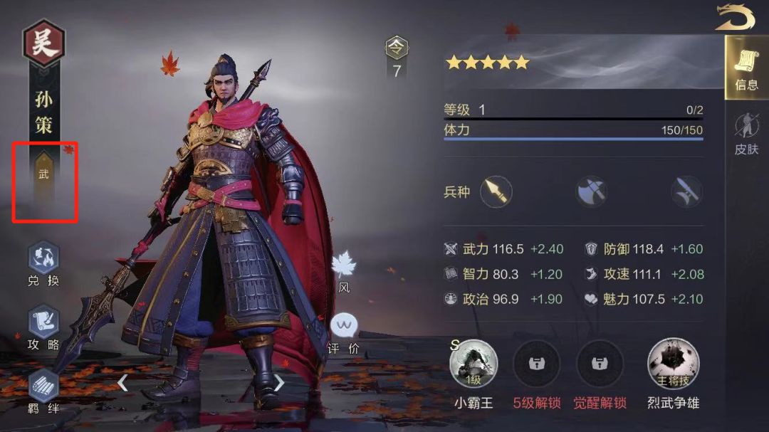 看一下孙策的定位就是纯粹的武力输出,除了高达2.4的武力值成长之外,自带技能“小霸王”具有【破甲】:无视目标一定比例的防御及武力减伤。【砺军】:造成武力伤害同时恢复一定血量。技能和属性都决定了孙策的强力武力输出武将定位。