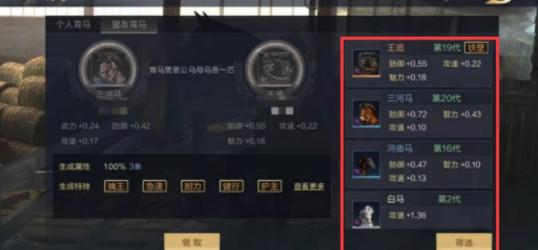 那么获得最极品的马匹的办法就是先通过漫长的属性培育,待成功获得3属性的极品“种马”后,再通过寻找盟友找到合适的“种马”,双极品“种马”互相交配,靠运气就可以获得高属性橙色的技能马啦!