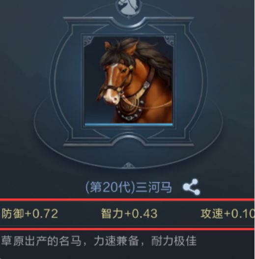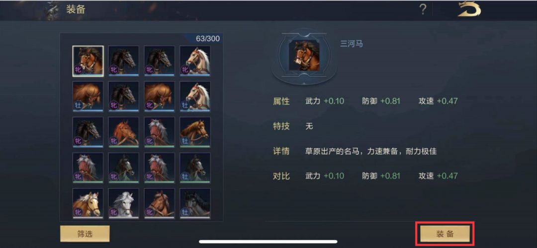 点击进入到马匹筛选列表,选中自己合适的马匹点击右下角的装备即可完成装备,具体属性点根据马匹的面板属性决定,直接和武将属性叠加,提高武将的属性。