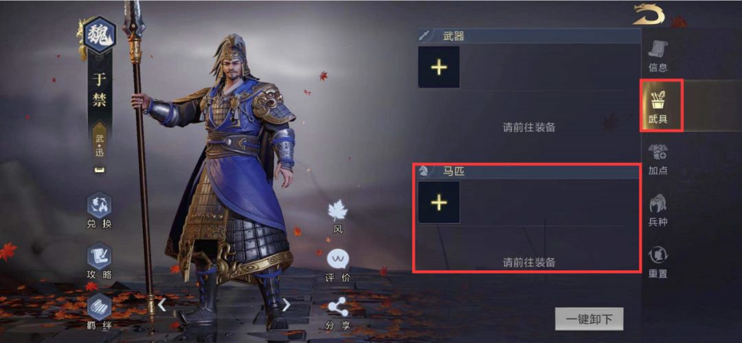 1、为装备该马匹的武将增加属性点,装备马匹需要通过前往武将的武具选项进行装备,如下图↓↓