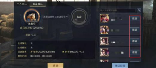 2、 寻找盟友进行育马,好处是消耗资源变少,坏处是无法100%控制盟友放置什么属性的马进行搭配,所以最好是先约定好一个盟友,对他进行单独邀请。