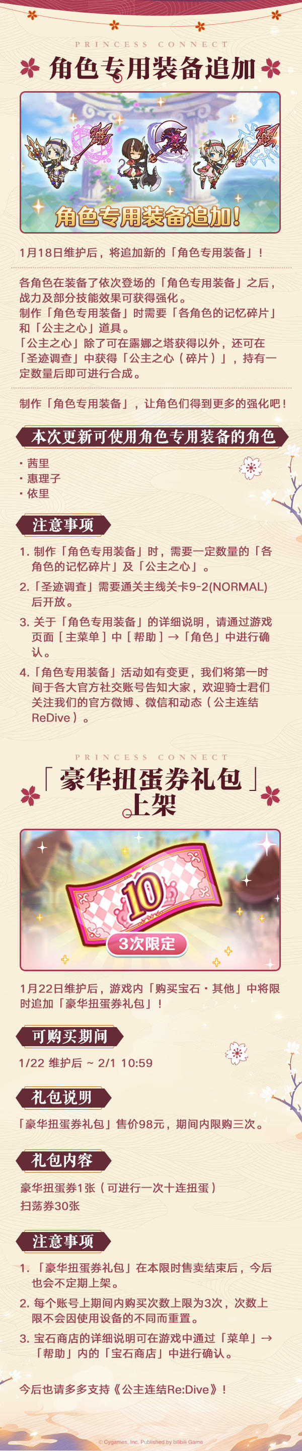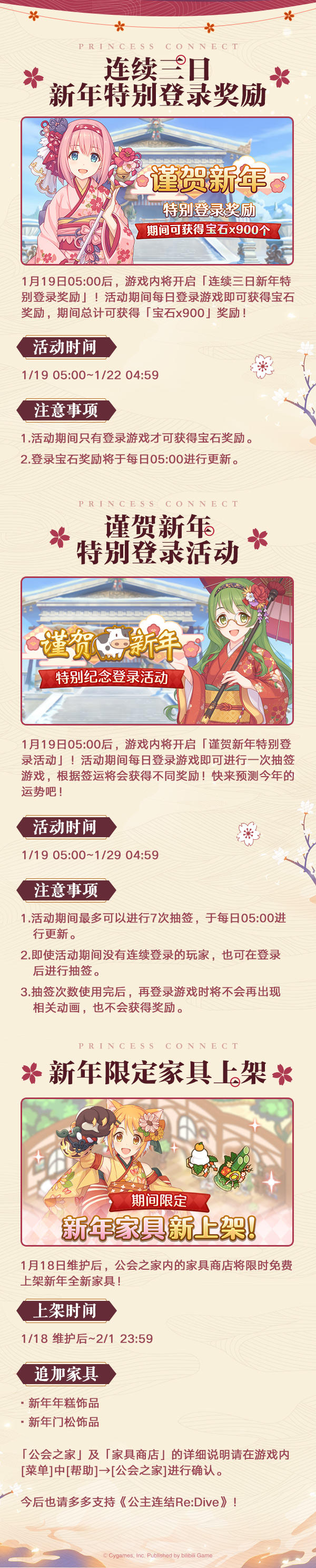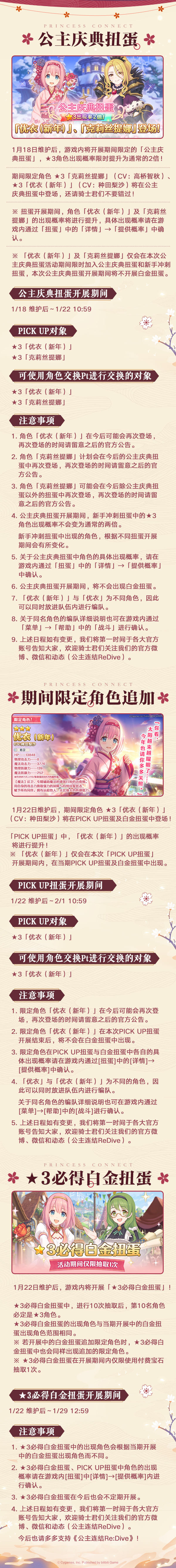 版本更新结束后,游戏内将开展★3角色出现率2倍的「公主庆典扭蛋」,限定角色★3「优衣(新年)」(CV:种田梨沙)及★3「克莉丝提娜」将在「公主庆典扭蛋」中限时登场;同时,游戏内将开放新年登录奖励以及新年特别登录活动,上架免费新年限定家具;还将追加新的角色专用装备!