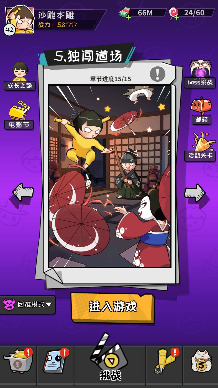 3挑战:忘记了普通模式过了第几关以后出困难模式了,不过这个不重要,普通和困难的主要区别除了战力和怪的差异不同以外就是产出不同。普通关卡固定产出为灵感值(修炼解锁全靠它)钞票(没钱寸步难行)勋章(商店买碎片的)碎片(全部是服装碎片,随着关数提升每关通关碎片数量略有提升不过目前只提升了低级碎片的掉落数量,橙装碎片始终是一个)