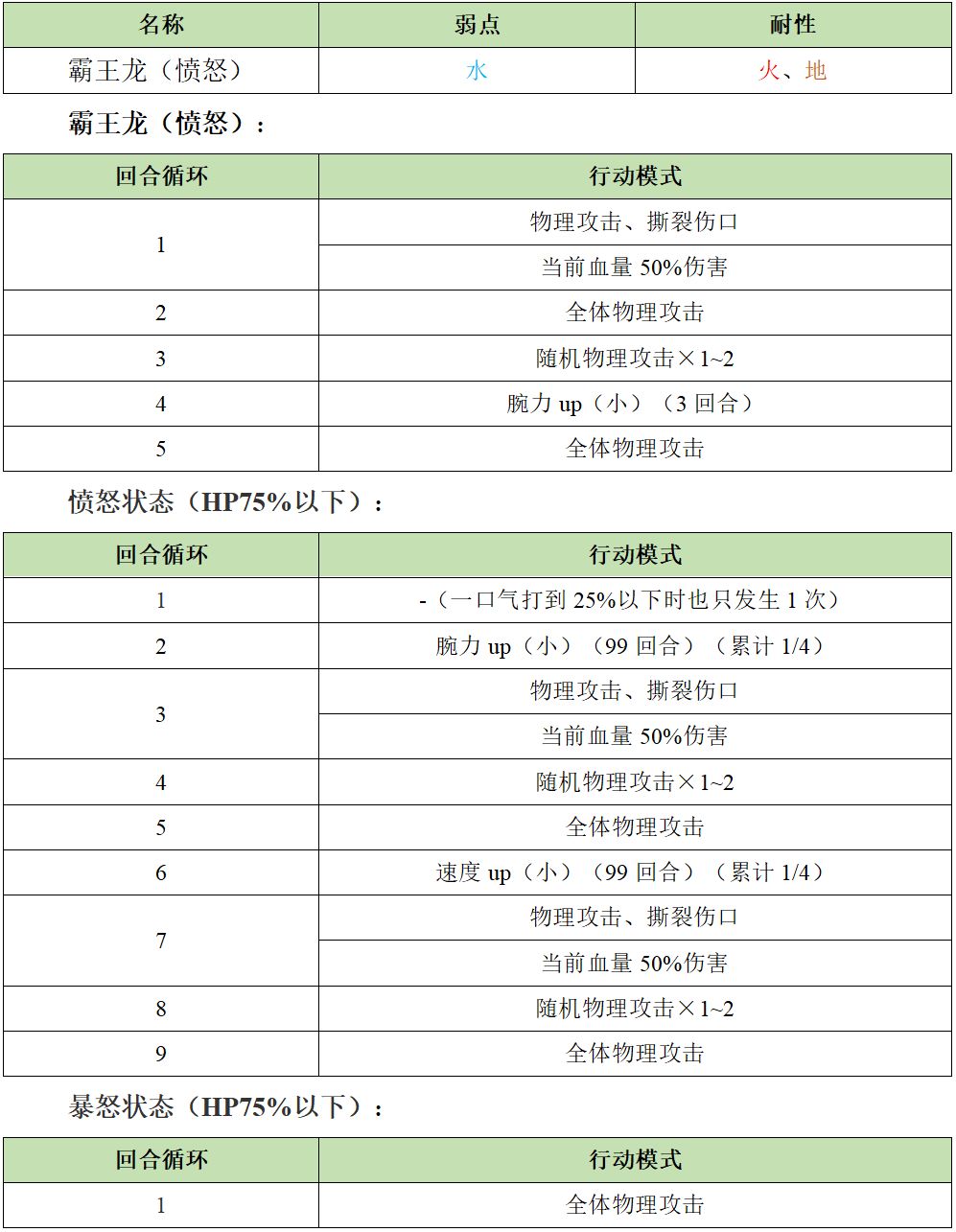 简评:腕力和速度会累计,所以越早击杀越好,buff累计会继承,所以~~我没见过不知道会怎么样!血量低于75%会愤怒,行动模式改变,25%以后会进入暴怒状态,一直全体攻击,总血量380w左右,差不多就可以开AF秒,BOX高的玩家可能见不到暴怒,甚至见不到愤怒,3T直接秒。