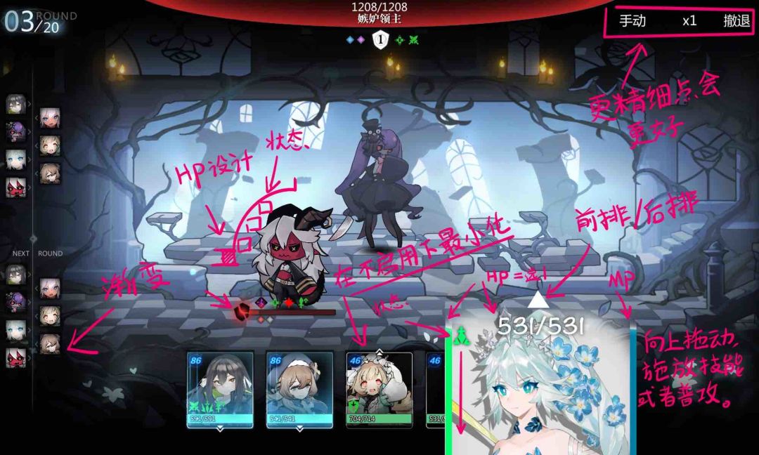 我的想法是,将人物的UI位置向右侧移动一些,当角色要释放技能时,可以把角色的UI放大,详细显示角色的状态,HP/MP。向上滑动角色即刻显示技能,滑动技能对准目标即可释放技能。
