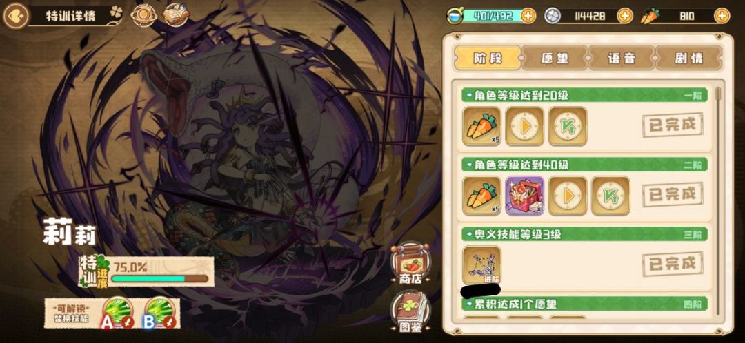 每位角色都有一个技能可以进阶为A或B,完成特训任务之后可以解锁