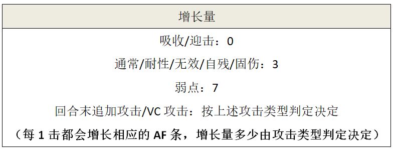 注意:全体攻击时,增长量的优先度为:吸收>弱点>其他(无论敌人数量多少,每1连只算1击;当敌人里有一个为吸收时,无论其他判定如何,都增长0)