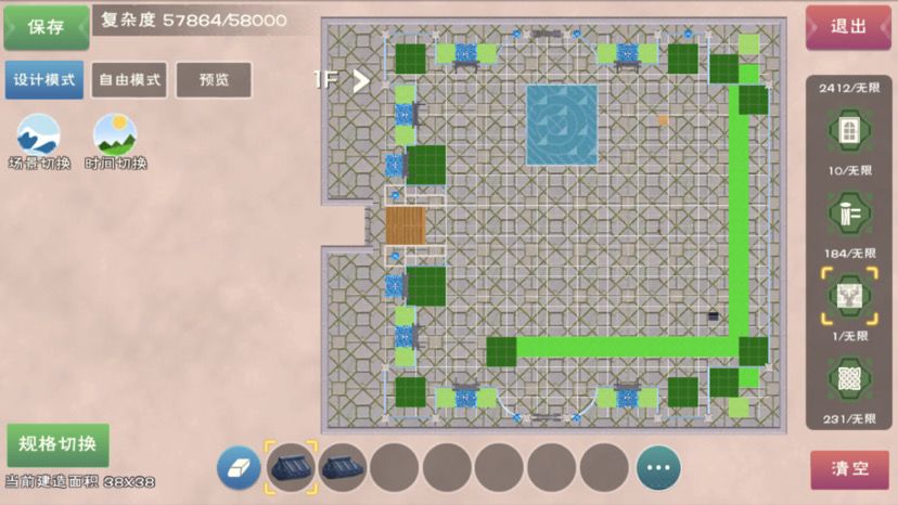 看起来建筑复杂度是接近58000,其实是我偷懒了,地板我都是没有做省材。这个可以去自己搜索一下怎么铺设地板省材和地板下种植。绿色的地板是标记种植区域,种完了都删去。