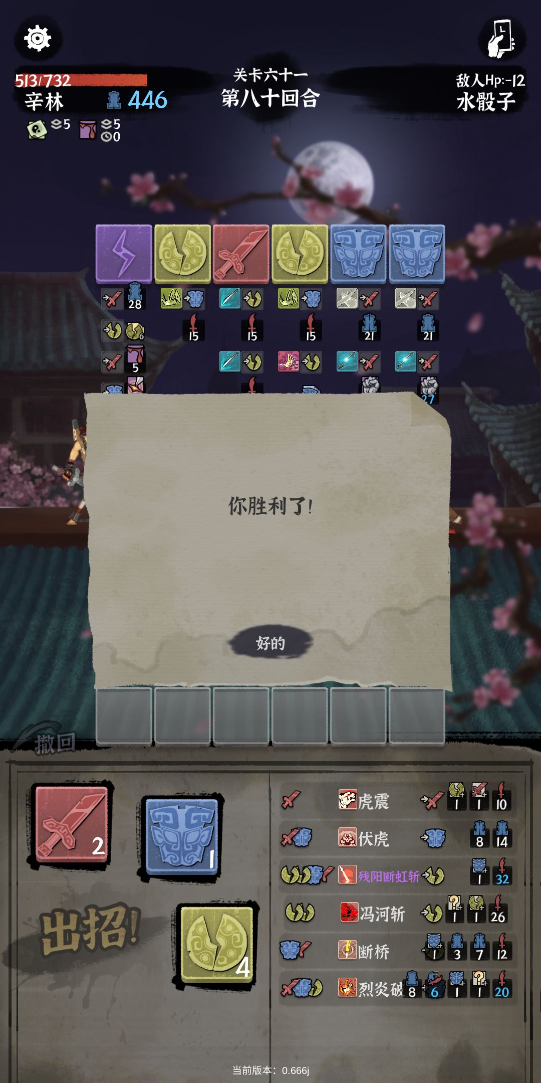 技能升级方向以减伤、额外牌、盾为主,原本设想是用虎啸的,但刷出个烈炎就试着用,连招挺顺。跟闪避流相比效率低很多,还要打的小心翼翼,随便一局都七八十回合