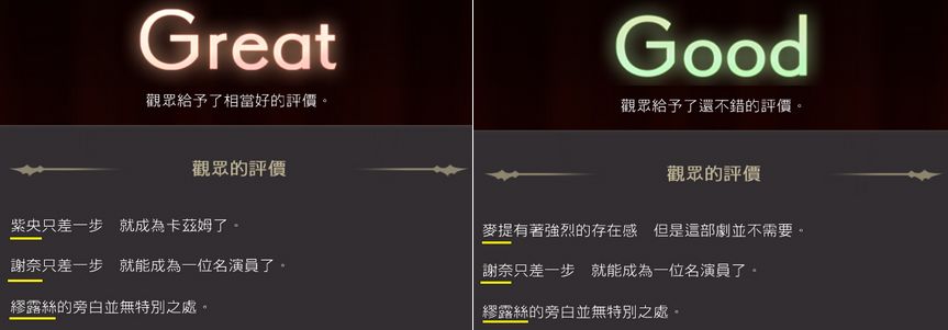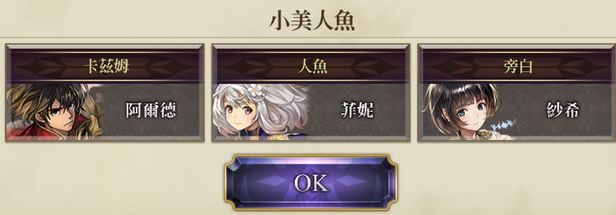 从自己持有角色中选择若干角色演出剧本。不同角色的台词根据角色性格会有所不同,演出结束后观众会给出评价。当你看到驴唇不对马嘴的台词时,笑就是了。例如剧本【小美人鱼】要选3名角色演出。