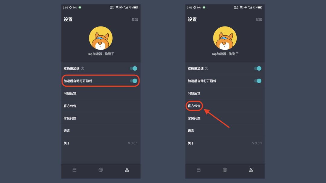 在以往的版本中,我们总是不能直接告诉大家关于加速器或游戏的各种最新消息。在新版本中,我们增加了“官方公告”这一功能,可以在个人中心找到。