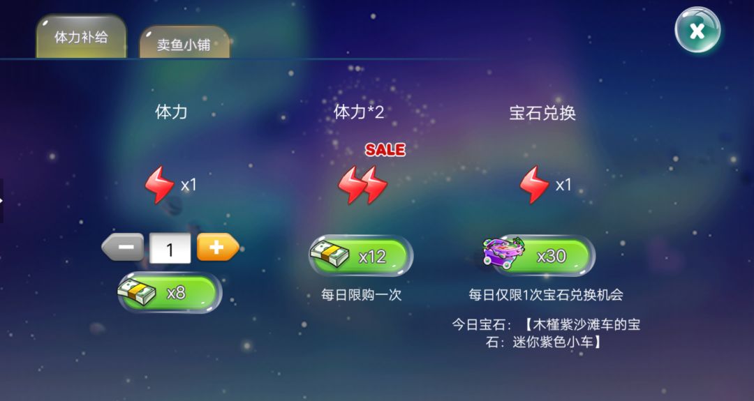 2、【暖暖商店】,活动中的暖暖商店可以进行体力补给和鱼儿直接购买,除每天免费赠送的体力,在这里还可以用宝石进行兑换~