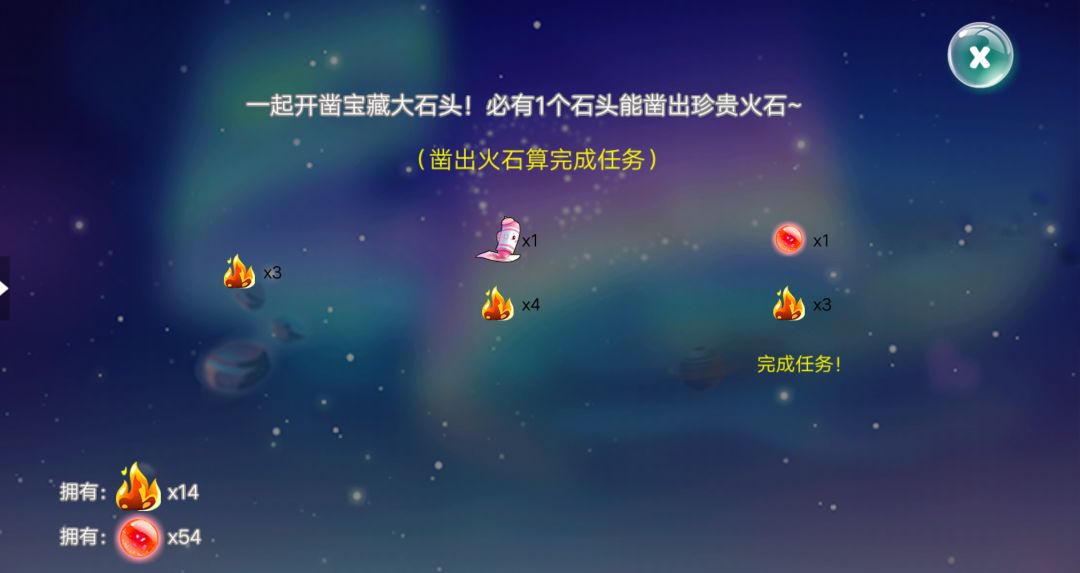 每次使用1体力飞往太空,每次可以触及3颗星球。一次登陆星球,开始采集火种和火石。