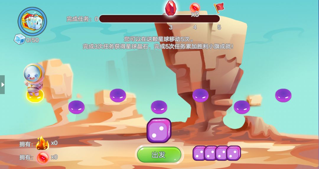 任意选择一颗星球登陆~登上星球,我们可以移动5次,每次会出现一个小任务,完成3次就可以获得该星球的晶石~