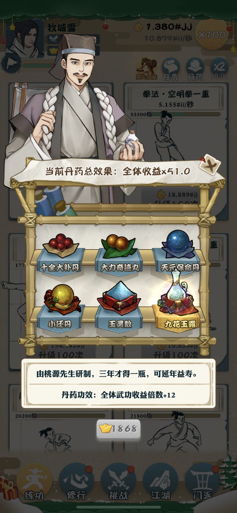 丹药都氪了51倍了,结果三个小时才翻倍43………也太低了吧。