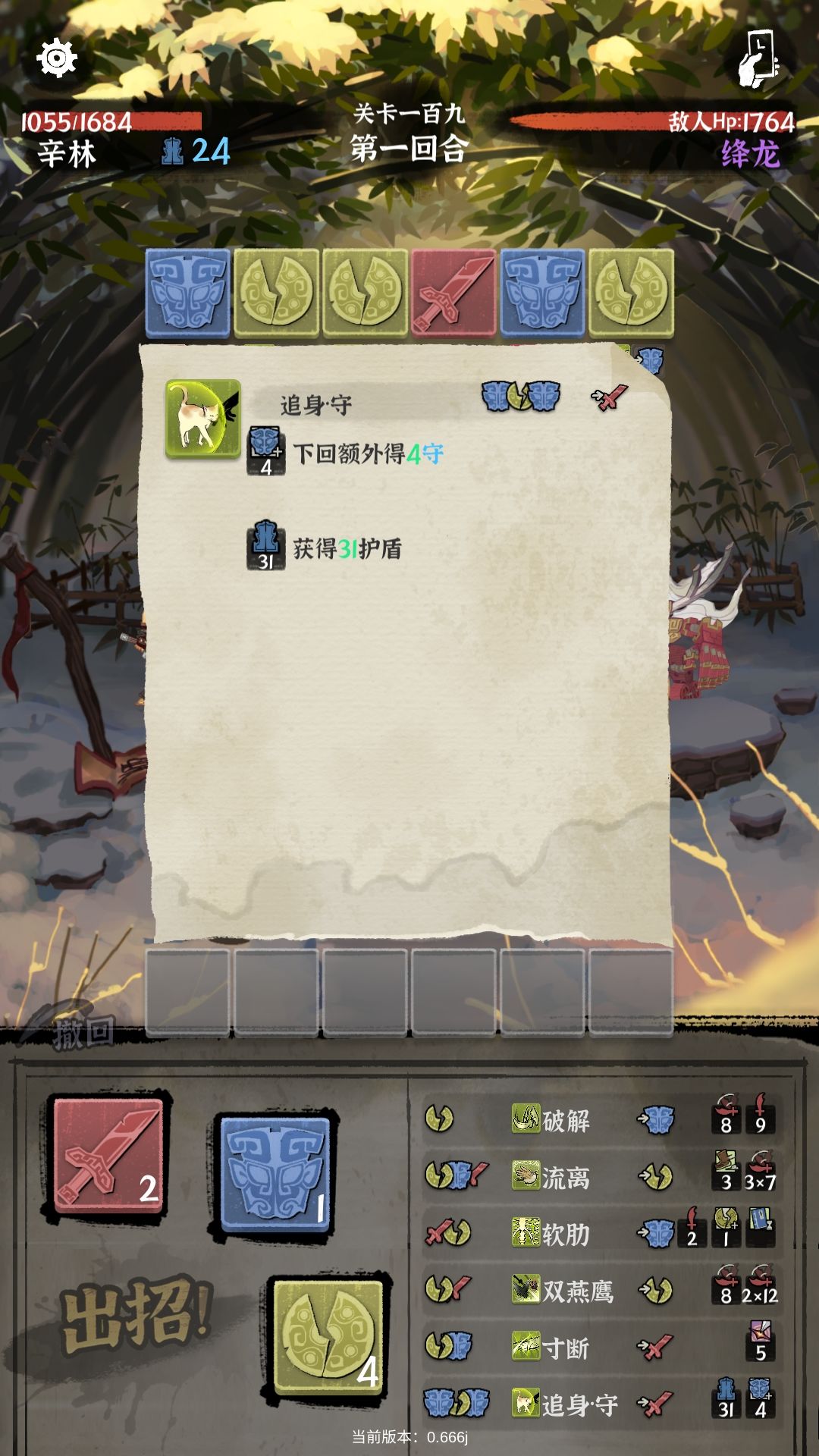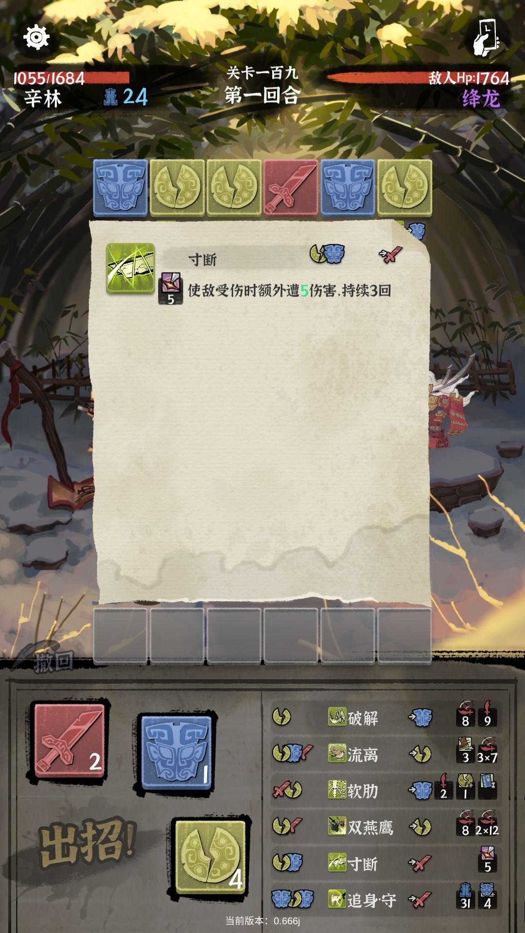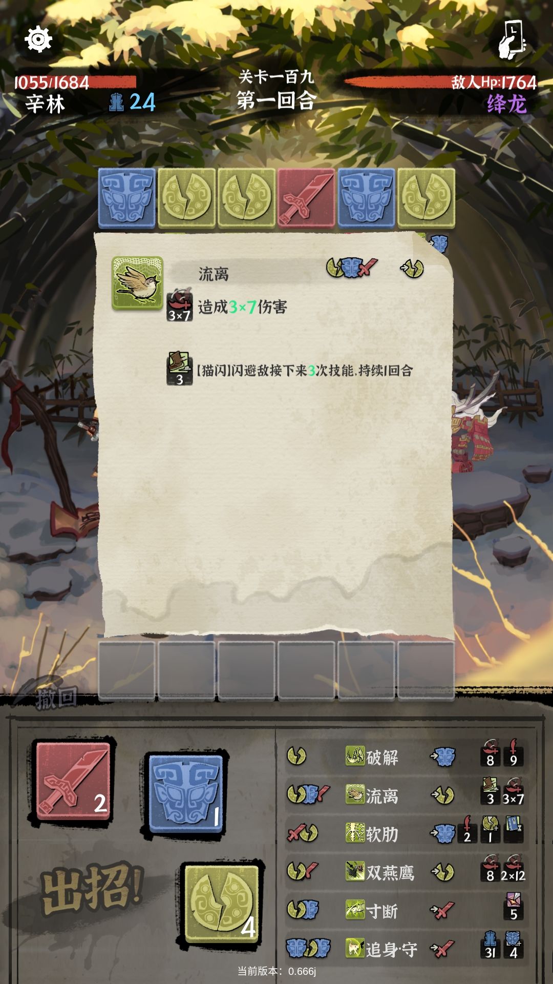 流离的好处在于提供比较稳定的闪避,红黄蓝三张牌的组合,在保底机制下保证你每回合不至于少牌而搓不出招,虽然单个技能的输出不高,但是配合弱点依然可观,后期是最优先考虑搓招的技能。