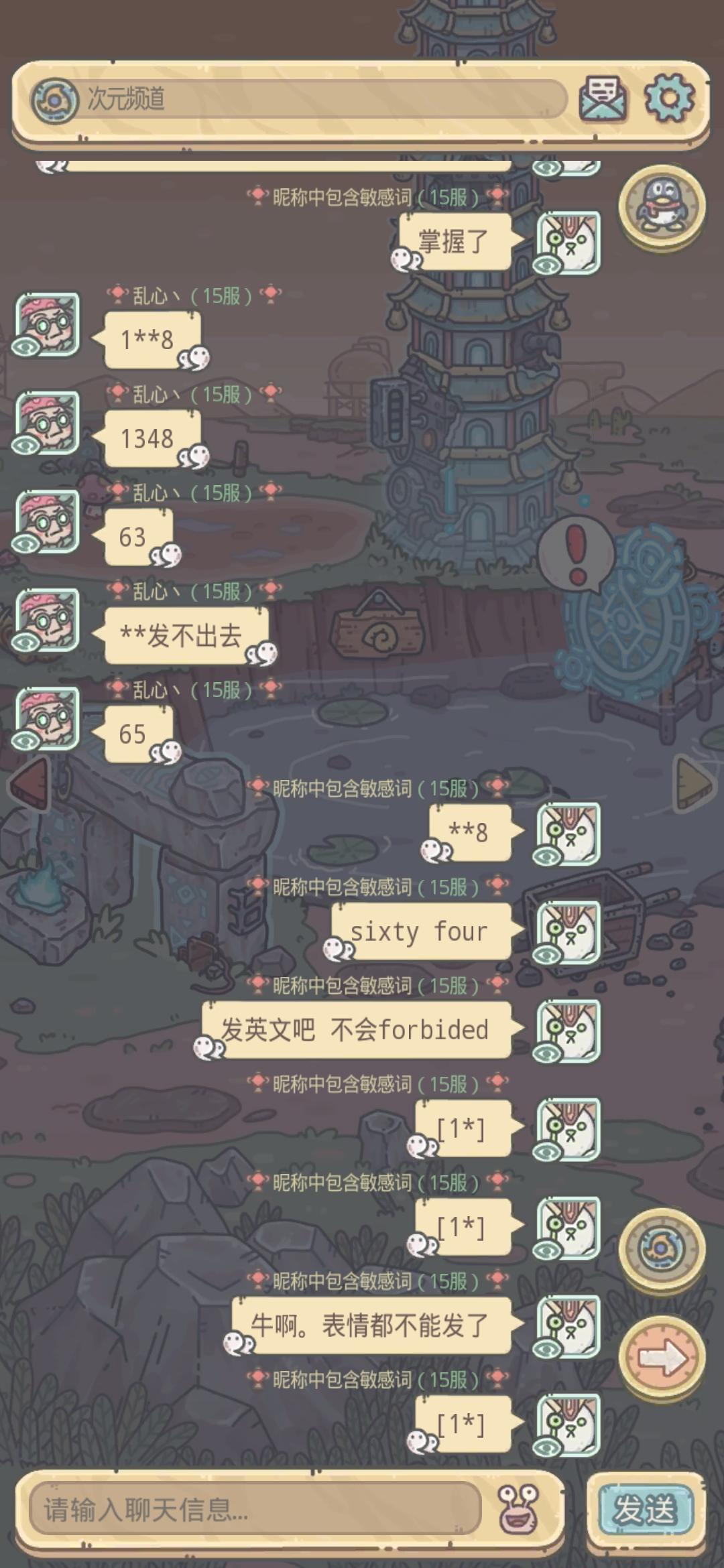 蜗牛是一个通过多人在线互动进行交流的休闲类游戏,但是这次更新后的敏感词系统是怎么回事?物种战争物种两个字被屏蔽 48也被屏蔽 甚至表情[18]8也被屏蔽……你怎么不干脆把聊天关了呢,说话全是***,*****! 俱乐部公告根本不能发出去,希望能尽快优化