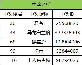 5. 每个ID最多限获得一个奖品,使用楼层数进行抽奖,不同中奖楼层数对应同一ID的,只发放一个奖品,其他奖品将直接顺延至下一个不同的ID;抽奖结果ID不符合活动参与要求的,奖品将直接顺延至下一个符合要求的且未中奖的ID。