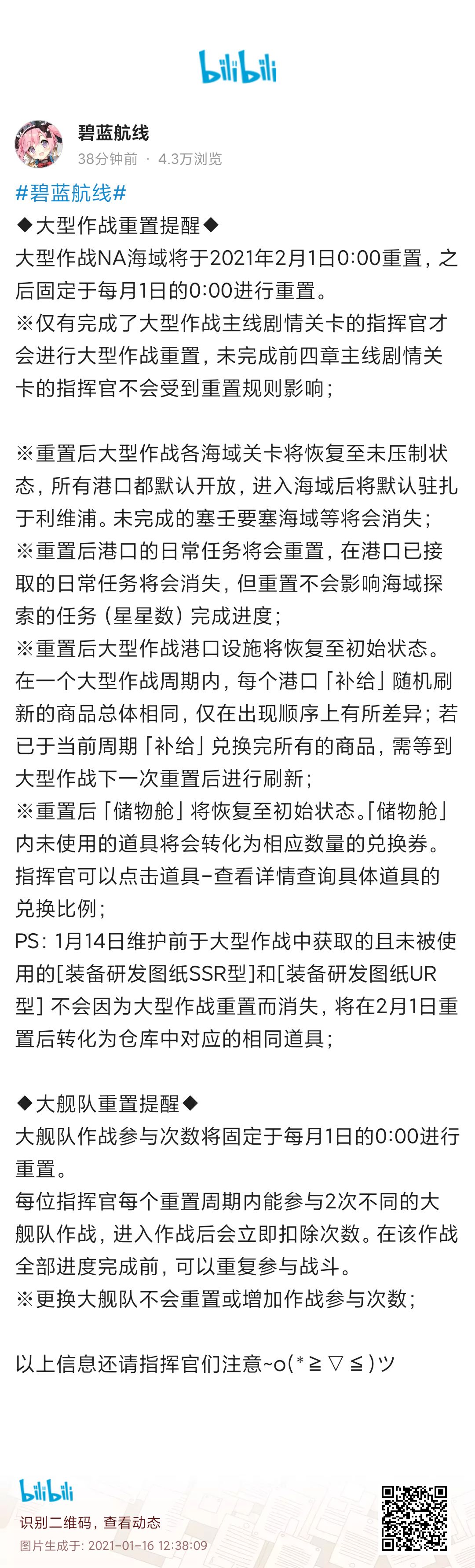 PS:1月14日维护前于大型作战中获取的且未被使用的[装备研发图纸SSR型]和[装备研发图纸UR型] 不 会 因为大型作战重置而消失,将在2月1日重置后转化为仓库中对应的相同道具;