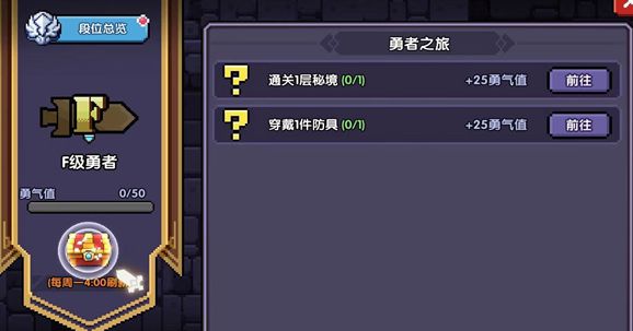 里面有勇者等级任务,尽量的做完,这决定着你解锁秘境层数的关键。这里面的宝箱是每周日刷新,建议是到周日把任务做完,勇者等级没法再升级的时候再领取。