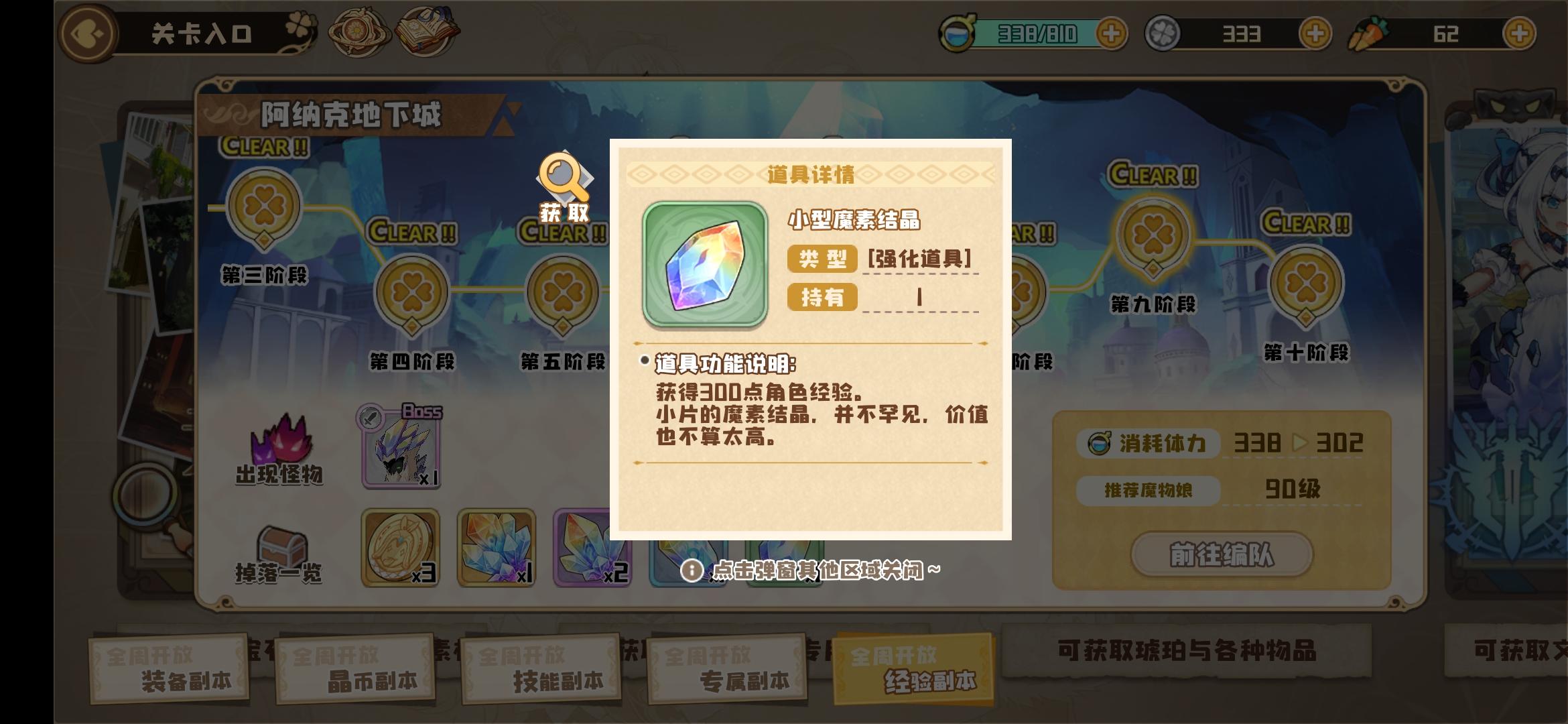 如图,经验十收益只比九高了200点,即使是绿魔素也是300点经验。为了逃课经验十,你要升级几个以后很难用上的角色,为之花费的经验数以万计。同时,如果用主力队刷经验本,一次每个角色胜利得到的经验是180点,主力队刷九比逃课刷十收益更高。