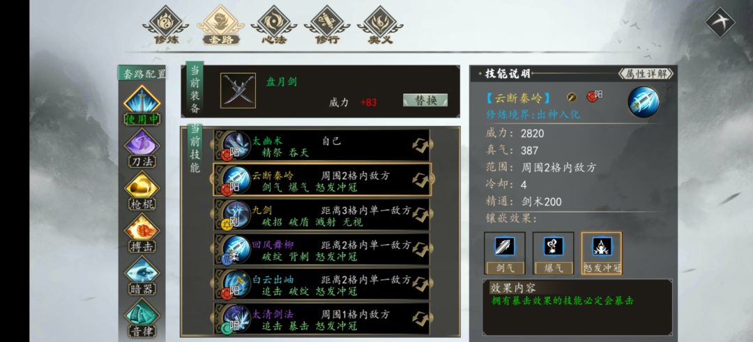首先是满江红的贯通,拥有暴击效果的技能必定暴击,什么技能叫拥有暴击效果,太清剑法打路致远也不是刀刀暴击啊