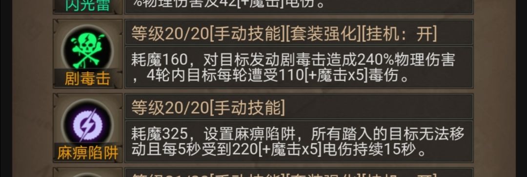 魔击流刺客主要靠技能打输出,剧毒击和麻痹陷阱都有着魔击力5倍一轮伤害,而且是多轮持续伤害!多轮!多轮!多轮!重要的事情说三遍!技能点力量敏捷各加60点,其他的全部加智力就可以了!