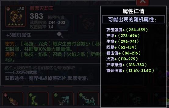 慈悲灭却玉:暴击,火攻,首领世界BOSS下不需要洗穿透也可以达到3400,搬砖的可以将首领换成穿透