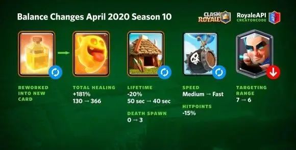 我个人认为2020年的4月平衡性调整是这一年最差的一次调整。不仅没有削弱当时过强的卡组,还把以前的弱卡哥布林小屋过度增强,让这张卡牌变得过于超模——甚至那时还出现了带有哥布林小屋的龙骑墓卡组。