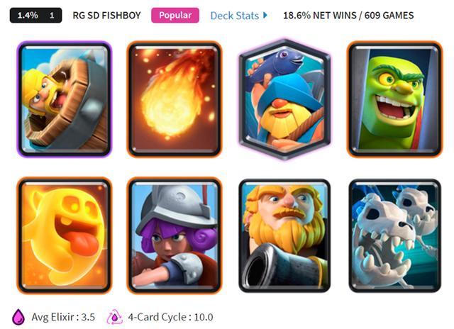 没错,就是渔夫家驹!这套卡组曾经在2019年9月火遍天下,后来随着渔夫的削弱而消逝。这次渔夫的增强无疑给它提供了一个绝妙的机会!不过,传统的锅炉家驹已经站不起来了(心疼锅炉啊啊啊),随之代替的是一套带有新伙伴奶豆和骷髅飞龙的小费渔夫家驹!渔夫家驹进入了第二次全盛期,从以前的推进打法变成消耗蹭血,官方在8月对小费卡组的打击(降低法术对塔造成伤害的比例)也阻止不了它变强!第14主题中,这套卡组尤为强势。可能2019年同渔夫家驹一起火的渔夫皮卡已经完全冷了下去,但是渔夫家驹,yyds!!!