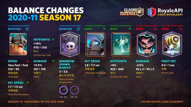 当时一看这个调整我有点懵,然后便是大喜。妥妥的防反新秀!在11月赛季中,野蛮人精锐的使用率上升了很多,不再无人问津。再看看其他调整,电法电车削弱,墓园小皮增强......没毛病