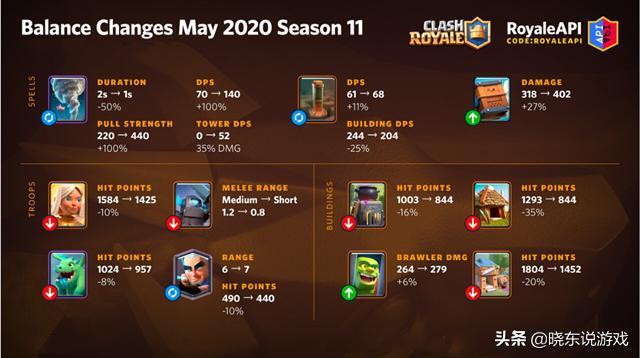 接着往下说。2020年9月,这套卡组中的一员大将治疗精灵的范围半径降低至3.5,从箭雨的范围降低至大电的范围。