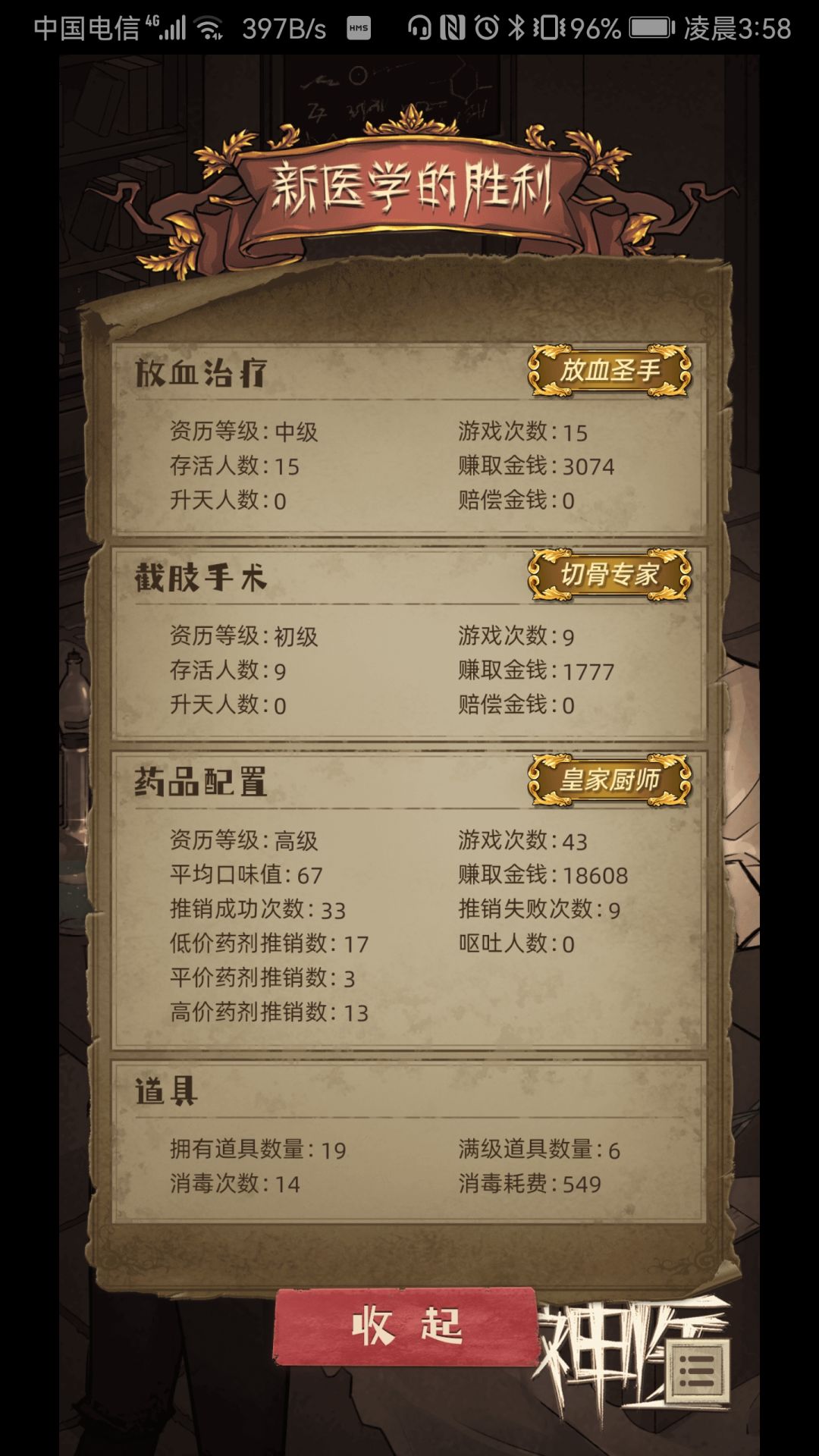 常阅图书的我,实在是不忍心看着自己的病人因为无能的医疗而丧命。又不想依靠手中的技艺对底层人民收取高额费用,所以在前期,医馆过的相对艰难。心怀善念的我无数次希望我们的夏特莱赶紧醒悟,与这个吃人的旧世界做彻底决裂,投身到伟大的医疗gm中去,以告慰无数含冤而亡的无辜病人。可我们的夏特莱,直到最后才选择站在真理的一边,看得我是十分着急。终于,已经成为了另一个斐诺——或者说是成为另一个安德烈的夏特莱,继承了两人与整个世界的希望与意志,对旧学院派彻底宣战,而为了打击教权扶持新医学派的王权代表“伯爵夫人”,也完成了此次资助的目的。旧教皇势力在该世界线遭受重创。而新的秩序将会建立,只不过这帮王权贵族想不到,当初自己利用的棋子,总有一天会把他们送上断头台与绞刑架…
