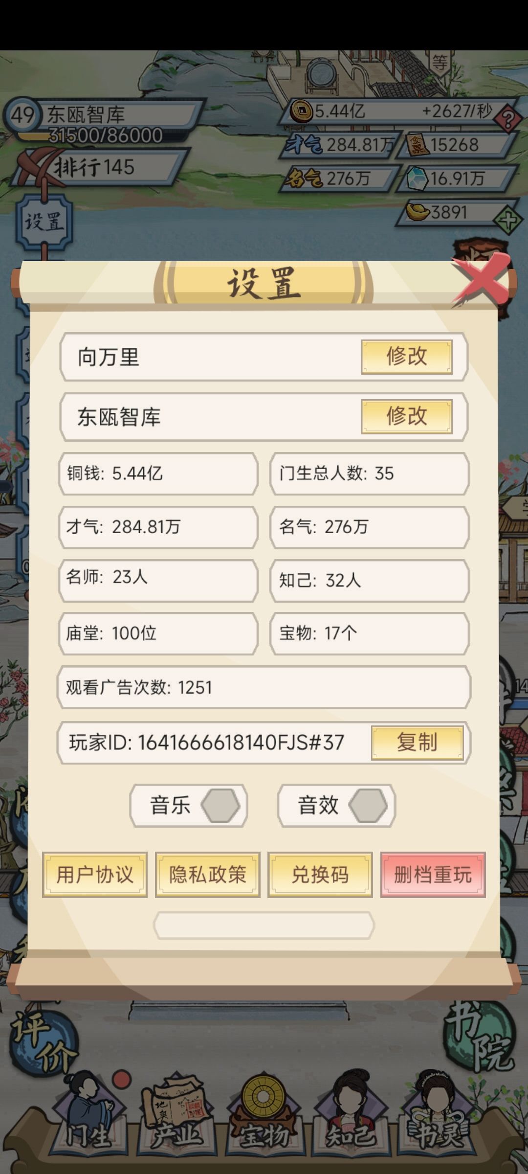 43.2小时毕业(看广告1251次,按每次45秒计算约等于看了15.6小时广告),虽然排名才第145,但是只要肯花时间等下去,排名最高第11早晚的事。为什么说毕业,是因为资源已经花不完了,纯粹耗时间等升级升排名。游戏玩法就是无限赛龙舟+斗阉党,龙舟赛完看广告加速继续赛,阉党好了就扳倒,光这两步资源就完成了永动,没啥意思了。所以我选择留出看广告得时间去肝其他同类型游戏。