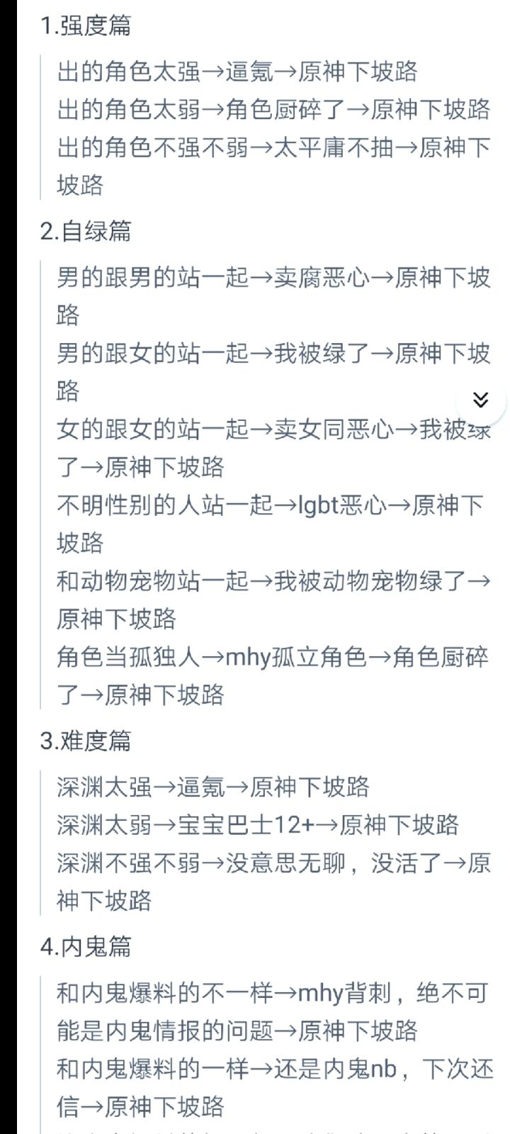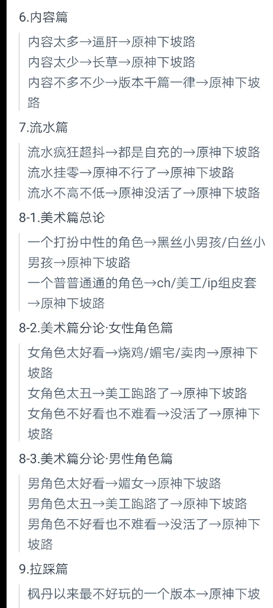很多人说原神傲慢,坐着老大哥的位置却没有很好的兼容其他游戏的优点,祖宗之法不可变,福利资源不上调,就吃一口干饭做一个瘦死的骆驼。我不敢苟同,如果你也是一个有点时长的老玩家,会发现原神更注重IP营销,与其说是游戏,不如说是形象,比如,每一个NPC和物件都不会一次性使用,会有自己的故事,多年后再次重逢就像一个老朋友;角色也并非只为主角服务而塑造,每个自机都要和各类人物形成生活圈和完善的人生经历,必须与世界观相结合,表面看起来就不像在服务主角,而是另一个主角;又比如武器和皮肤,不会硬插入凭空生成一段背景,一定要结合剧情出皮肤。这一切都是在多方面塑造一个庞大的世界观和IP,而很多人理解为傲慢,为啥出个皮肤还要结合剧情,还不如自己打mod来的快,用这个理论就很好的解释了,一切为IP服务,如果硬出皮肤破坏IP,那就不出。