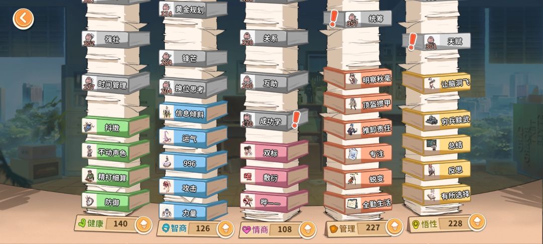 游戏中我们会扮演一位职场新人,在公司里经历各种事件,通过事件来获得属性点和零级性格。在属性点达到技能解锁要求后,要通过游戏界面中的日常搬砖解锁,之后在工作领悟中概率的获得技能。