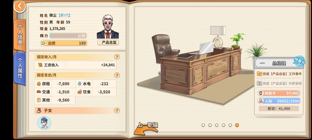 再来说卡牌,每种属性都有对应的卡组,就比如情商的叠毒流,管理的弃牌流,怎么玩就看自己的喜好😁。游戏打击感还是不错的,主线就是通过层层测试升上总经理,我觉还是挺难的,最后主线给的属性不够,达不到测试要求😂,所以我推荐刚玩这游戏的玩家可以先悠闲的玩,打游戏就要快乐😭,觉得养成玩的差不多了,那就开始总经理之路吧。(没有到的也不用担心,有后代轮回 )