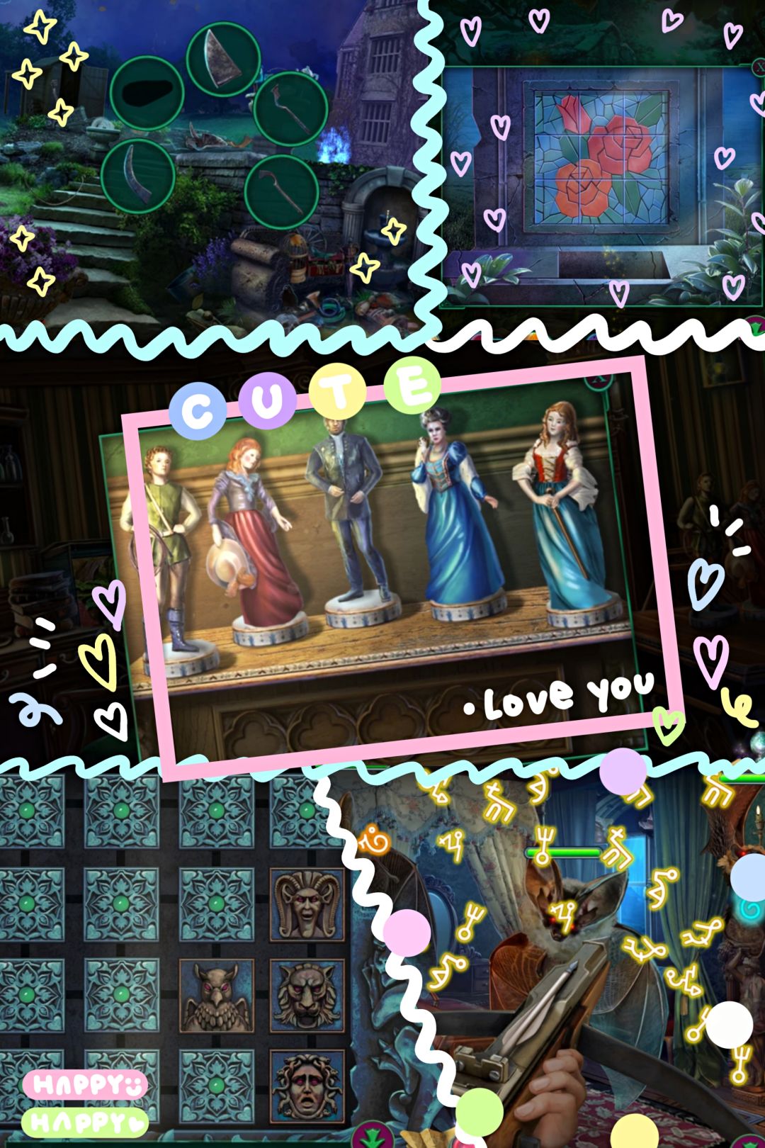 这部特别的是找物场景会有亮光提醒你,不用像别的作品翻来覆去到处戳;其次部件组合会有阴影提示,但也有部分与场景过度融合,所以有一定难度;再来就是我很喜欢复原的找物主题,强迫症爱好者表示很舒适;最后每天能看3个广告得3金币(点看视频不灵敏,需要多戳几次,右上金币有红点就是还可以看广告),跳过关卡需要15金币,因为懒得等所以真的有好好动脑,附上收费关唯一觉得有点难的石块解谜攻略(可以先把鹰转到左下,然后调整其他三块如图方位,再把鹰转回,然后按鹰旋转其他三块🤗)
