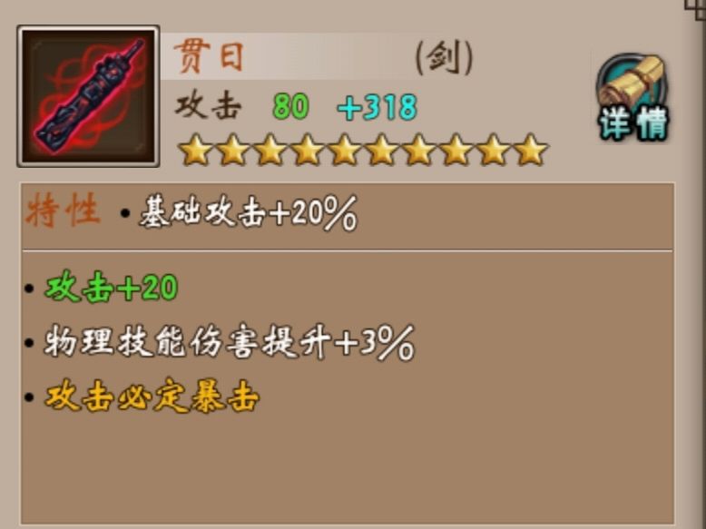 这把剑的亮点就是必定暴击且基础攻击+20%,堪称平民版金蛇刺,要知道在游戏开始运营之初的很长一段时间必定暴击的武器就只有龙胆枪,但那只是V10以上玩家的福利,平民望而不可及,现在这把武器出来了,你说它香不香,虽然现在平民能拿剑的人不是很强力,但是总算是一件能拿的出手的神器,没准后面有奇用呢。