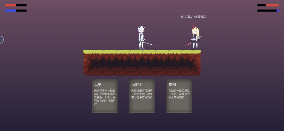 而长距离的话,如果距离不是很大,飞刀也会被对方的横扫克制而被打断,而且没有飞刀牌的时候,长距离几乎坐以待毙,除了等待对方走进横扫区间就没有攻击手段了。当然,长距离也不是我能控制的,我最多站到悬崖边,此时距离的掌握权就控制在AI手上,我预料不到对方什么时候一个横扫冲过来,或者用踏前斩逼近距离,因此横扫不能做到一击必杀;同时我此时被逼到死角了,中长距离下对方的横扫劈过来,后撤步和防反都不能闪躲,只有闪避牌能救命。因此,长距离会被动,在悬崖边也被动。