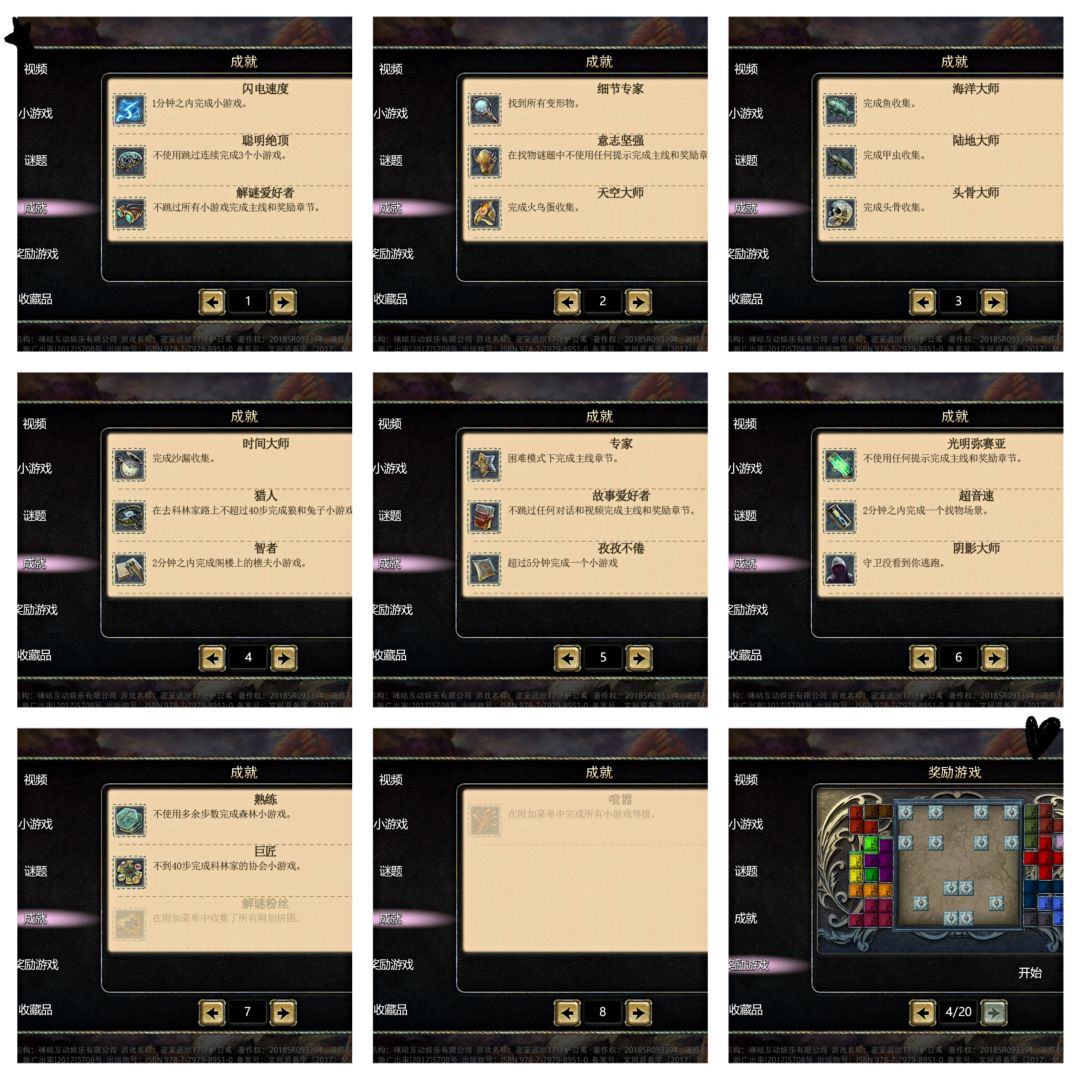 然后表扬一下这部的优秀之处🌸找物关标明物品的轮廓,且大多有先后顺序,清晰明了👏隐藏变形物一个场景两个,画面四处都点点基本不会漏~并且小游戏都单独列在了收藏里,对强迫症要攻略小游戏成就特别友好!再也不用从头开始玩!