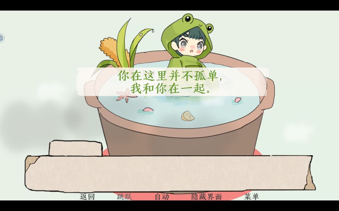 在相信你之后小青蛙会和你讲他之前的故事,讲他之前爱的女孩子,最后因病逝世,那个女孩子也是这样安慰他。我有一个小想法,他爱的那个女孩会不会也是曾经某一个玩家,病痛折磨的她身心俱疲,她每天隔着屏幕与他倾诉。小青蛙不想回到现实世界,他想在这样一口快要沸腾的大锅里无忧无虑,不去想那些现实中的失望与疲惫。