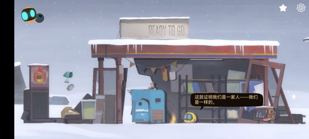 对于这款游戏,除了画风,我想夸一夸细节,经过的每个物件几乎都有自己的故事,在铜堡镇等待主人的机器人,无尽的等待,身上的零件已经落灰和陈旧,“扫地机器人”成了“搜集者”,它曾经是那么骄傲和自信……