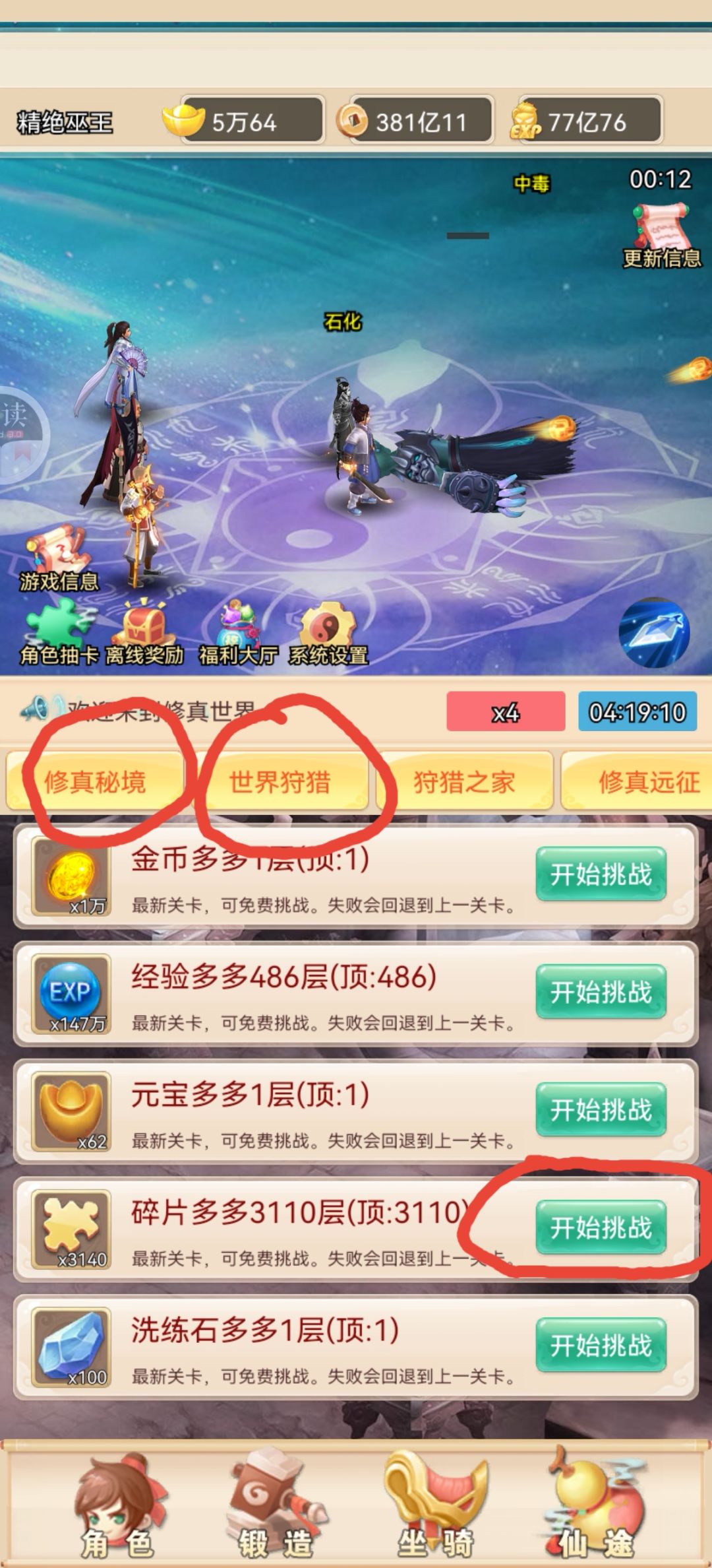 整个过程,除了刚开始推图刷一点等级开启仙途版块,挂碎片多多和世界boss(经验元宝铜钱),很快就打完收工,坐等作者更新。