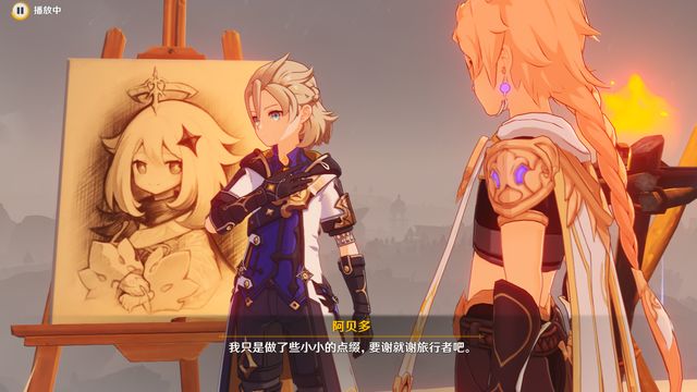 此外,在原神中,故事并不是始终严肃的。角色的对话,物品的描述甚至成就的名称都藏着很多彩蛋,这些彩蛋通常来自各大经典作品,包括但不仅限于jojo,eva,cowboy bebop,刃牙(如咸鱼大剑就是neat郭海皇,它老死了!),影视作品甚至一些文学和艺术作品(如图二,阿贝多的蒙娜丽莎-派蒙)。这种贯穿始终的设计更容易让玩家产生(同好)产生共鸣,即使有如坎瑞亚覆灭这样黑暗残忍的故事,原神也不会完全陷入其中,使之成为在末世苦苦挣扎的黑色写实正剧。原神和它世界里的角色大多是昂扬的,即时它的故事整体基调是深沉甚至压抑的。