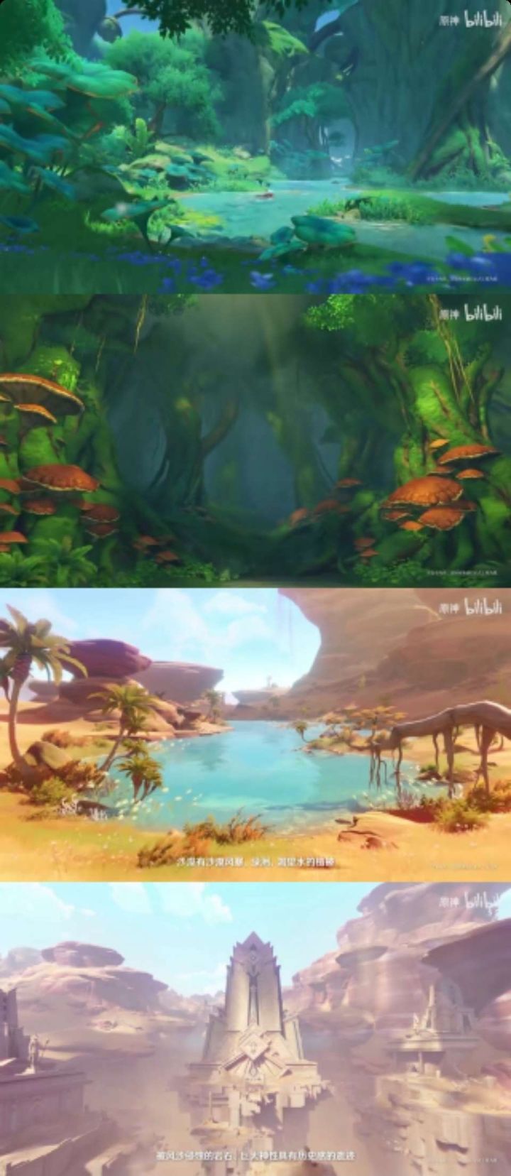 原神标榜自己是一部“开放世界”游戏,这一突出特征体现在游戏中,就是原神会在提瓦特的大地图上不断更新和开放新的地区,从蒙德,璃月再到稻妻,以及即将发布的须弥,这张世界地图上的未知区域被一点点填满,玩家的脚步也将伴随着地图更新踏遍原野和高山,海岛和雨林(如图一,官方视频须弥截图)。