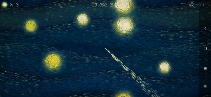 这是一款难以形容的游戏,如果从游戏的内容来看其实非常简单,我们将扮演一颗流星,在《星月夜》的星空里,用有限的移动距离,一点点的向十万光年外的她靠近,看流星盘旋,在何时时机点出,让他飞往天际,就是游戏唯一的操作方式。
